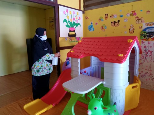 (15-03-2022) hari pertama masuk sekolah, TK Bhayangkari Putussibau melakukan penyemprotan ruangan sebelum anak-anak masuk kelas, Ibu Helmiwati, S.Pd selaku Kepala Sekolah menjelaskan bahwa mereka sangat memperhatikan kebersihan ruangan dan alat-alat permainan, terutam di saat musim pandemi, sehingga orang tua tidak merasa was-was saat anak-anak mulai belajar. Selain kebersihan, pihak sekolah juga menyiapkan masker cadangan, apabila ada anak yang lupa membawa masker, mereka tidak perlu pulang untuk mengambil masker, karena masker sudah disiapkan. Selain itu terkadang jika anak-anak terlalu asik bermain, bisa saja masker mereka terjatuh.